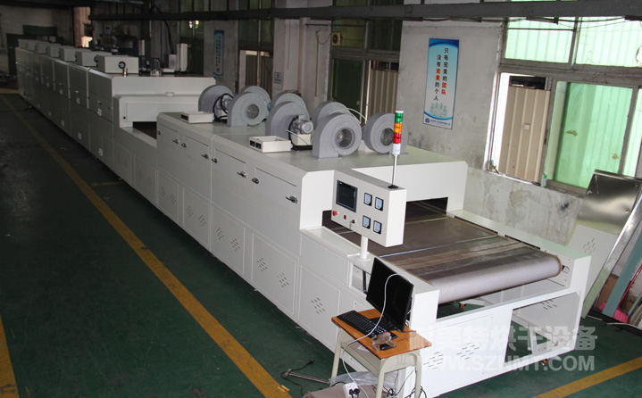 2、外形尺寸(約):總長(zhǎng)24500mm*總高1740mm*總寬1890mm,地面到網(wǎng)帶的高度為950-1050mm,爐體內(nèi)進(jìn)料高度為150mm;烘干部分總長(zhǎng)14000mm,分7段獨(dú)立控溫(每段4個(gè)測(cè)溫?zé)犭娕迹慷?000mm。冷卻段長(zhǎng)4000mm,UV區(qū)2000mm,前后緩沖區(qū)各長(zhǎng)500mm,進(jìn)料部分長(zhǎng)2000mm,出料部分長(zhǎng)1500mm, 爐體前后大梁上方裝有急停開關(guān),共4個(gè)。